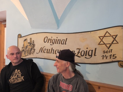 Anderntags erwischte ich dann doch noch ein paar malerische Ecken auf den ersten Kilometern des nächsten Abschnitts. Auf der Ruine Falkenstein konnte ich wiederum mutterseelenallein länger pausieren und die Sonne genießen. Überhaupt traf ich auf der gesamten Strecke nur ganz wenige andere Wandersleute, fast schon schade um die detaillierte Beschilderung. Später traten die Hufprobleme wieder verstärkt zu Tage, geschmeidig Laufen ging schon mal deutlich besser. Zum Glück war's der kürzeste Abschnitt, so dass ich nicht allzu spät im gefällelastigen Hoof ankam. Meine FeWo schien ziemlich brandneu saniert worden zu sein, ein Traum in frisch gefließtem Weiß. Nach Dusche und Stärkung besuchte ich noch die örtliche Gastronomie, im Bistro Himmel hatten sich die drei örtlichen Biersommeliers versammelt. Der älteste schien sich dann auch zu freuen, mal einem Fremden die großen Klassiker des lokalen Feuerwehrwesens näherbringen zu können. Immerhin ein nettes Unterhaltungsprogramm neben dem Genuss der Kaltgetränke.